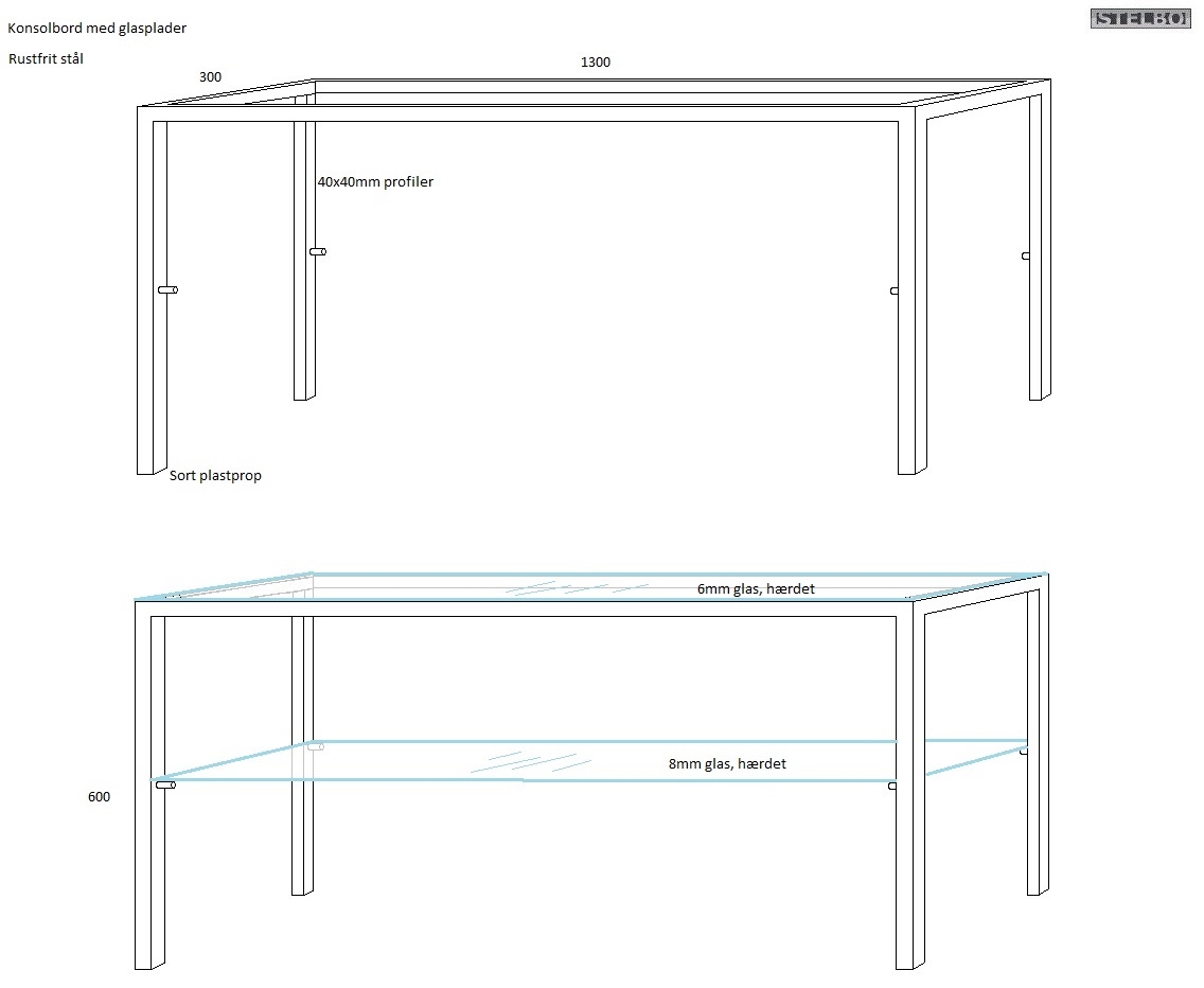 20170112 Specialfremstillet konsolbord med glas, Rustfrit stål. 130x30x60cm