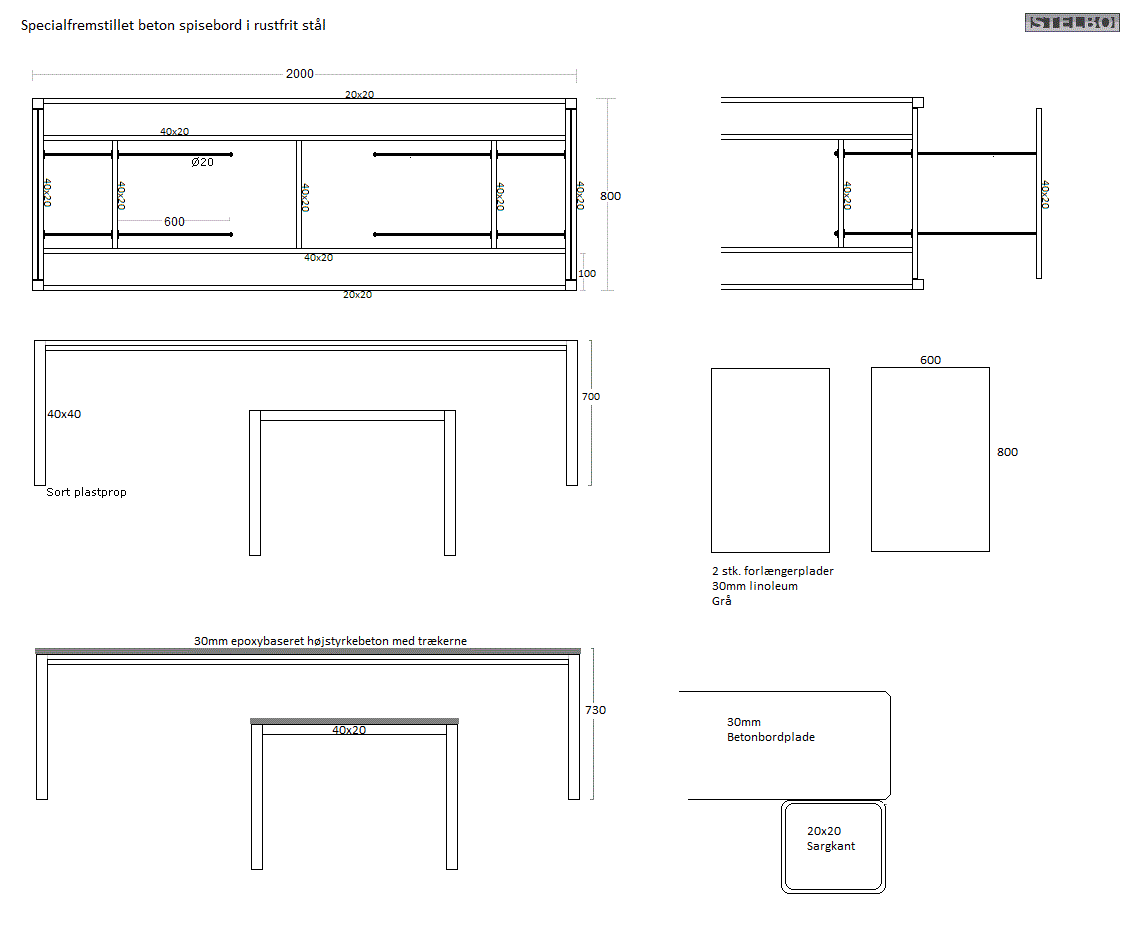 Yderste sargkant på stellets langside: 20x20mm. Forstærkninger på 40x20 placeres længere inde under bordpladen