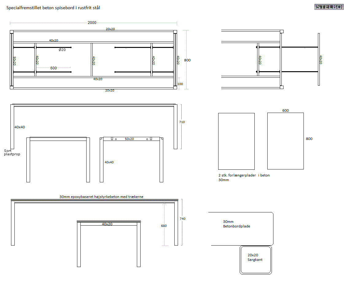 Yderste sargkant på stellets langside: 20x20mm. Forstærkninger på 40x20 placeres længere inde under bordpladen