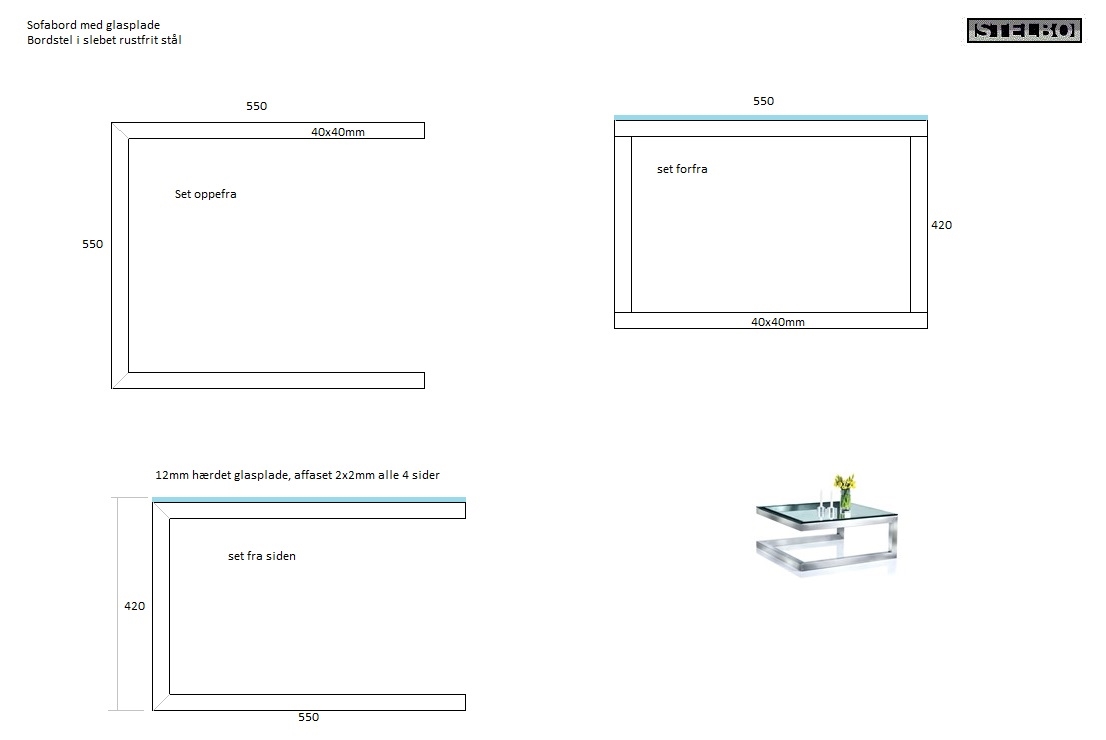 20170425 Specialfremstillet sofabord med 12mm glasplade. 55x55cm, højde42cm. Rustfrit stål