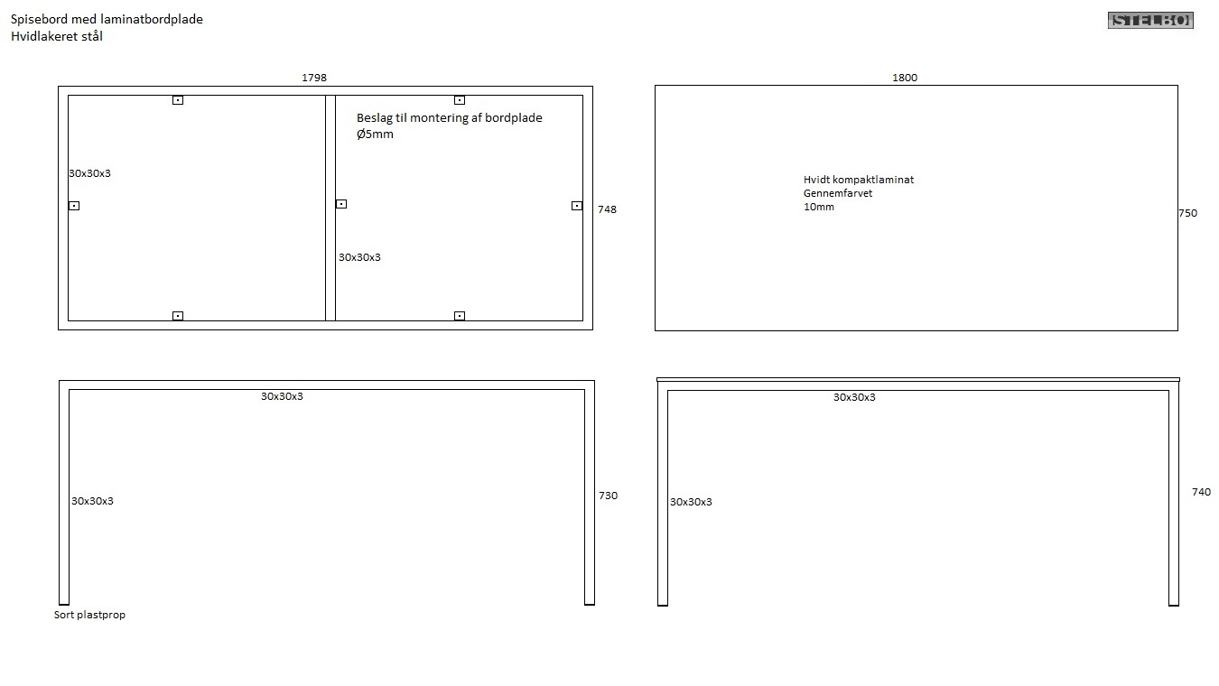 20170508 Specialfremstillet Spisebord med hvidt kompaktlaminat. 180x75x74cm. Hvidt stel 30x30mm