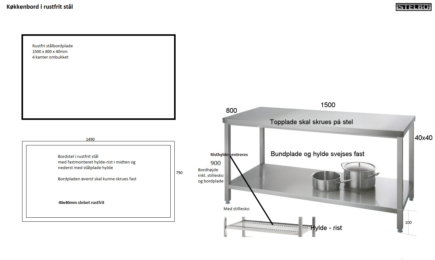 20170626 Specialfremstillet køkkenbord. 1500x800x900mm, 40x40mm Slebet rustfrit stål, 2 hylder