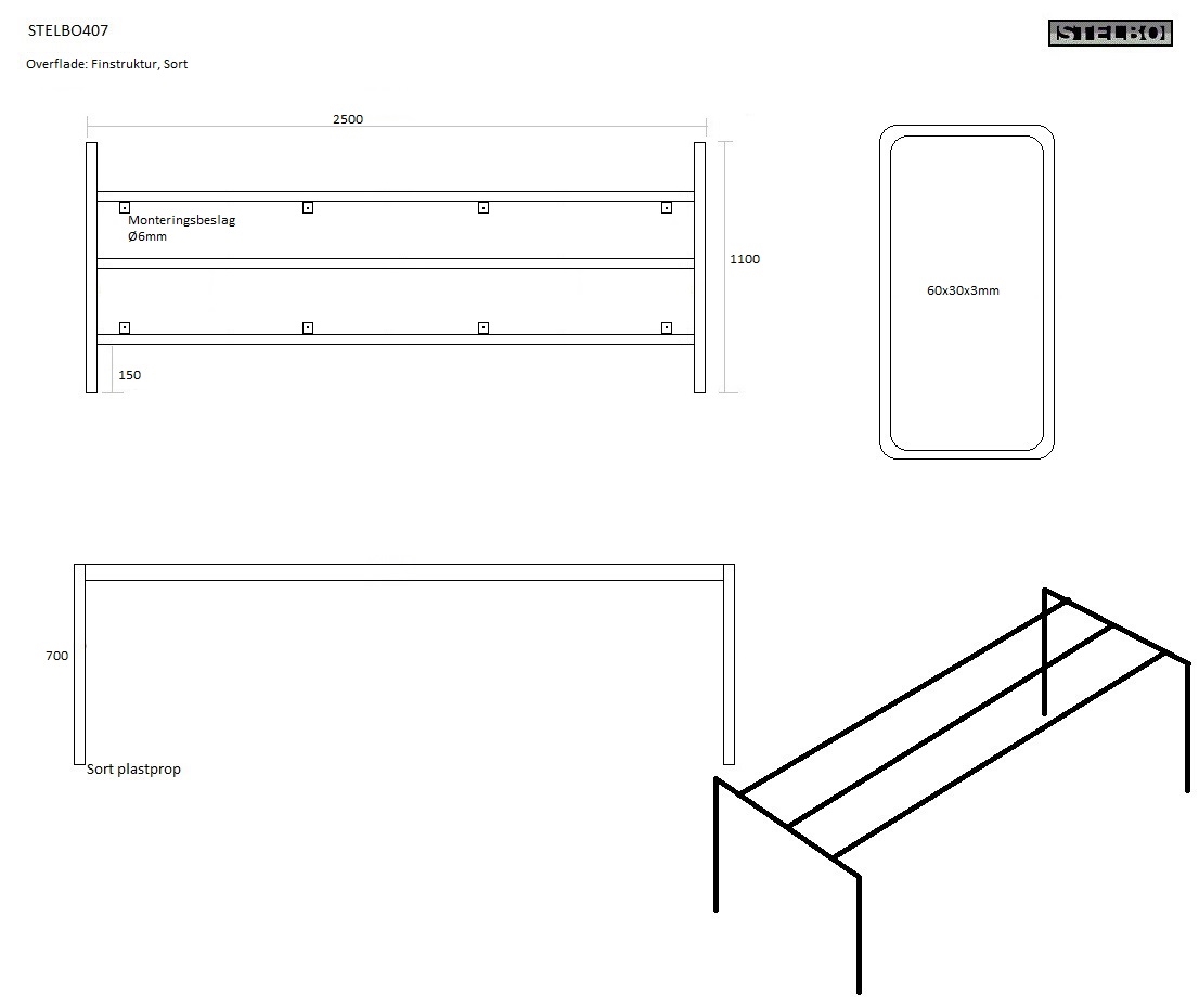 20171003 Specialfremstillet bordstel. STELBO407, 250x110x70cm, Sortlakeret