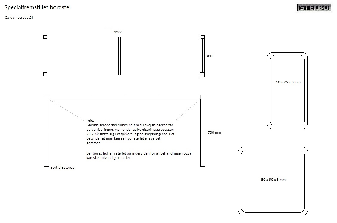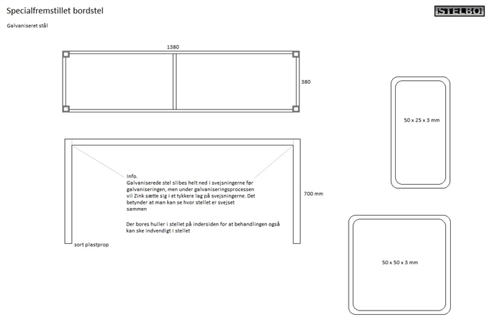 20180502 Specialfremstillet bordstel i galvaniseret stål. 1380x380mm, 50x50 + 50x25mm