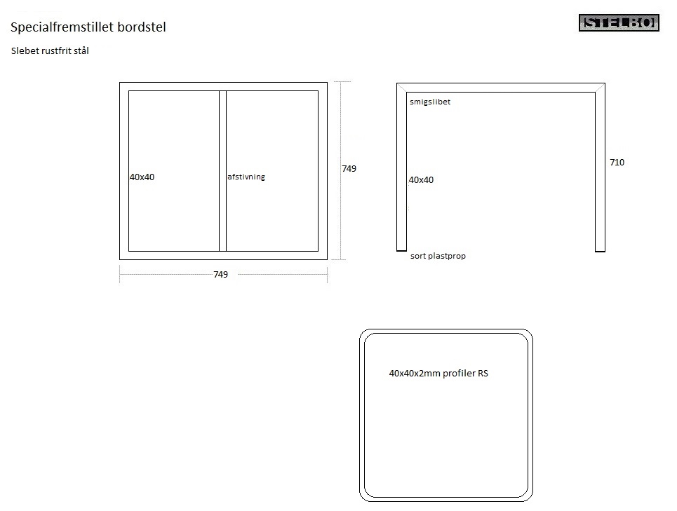 20180515 Specialfremstillet bordstel i rustfrit stål. 749x749x710mm