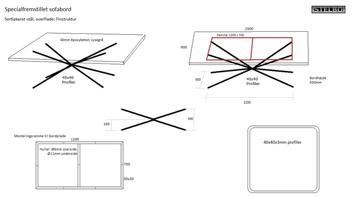 Bordstel i sortlakeret stål, krydsstel: 3900,- Der monteres ekstra ramme med beslag i toppen til montering af bordplade
