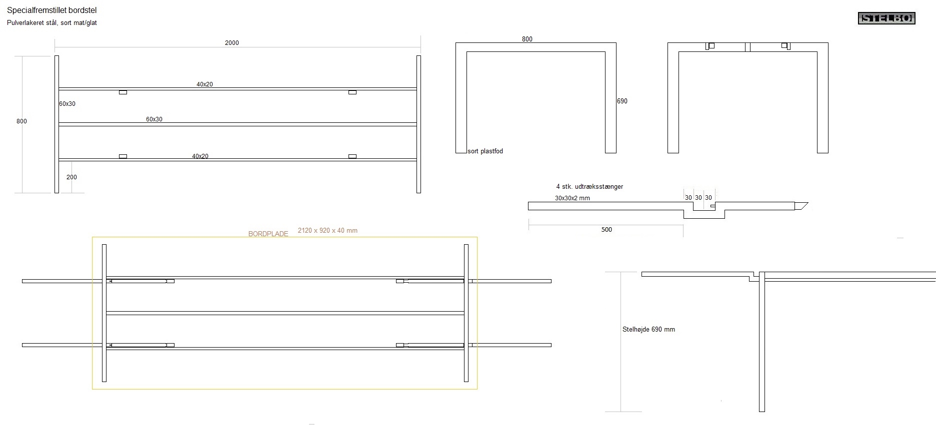 20181030 Specialfremstillet bordstel i pulverlakeret stål. Til 2 forlængerplader. Inkl. fragt