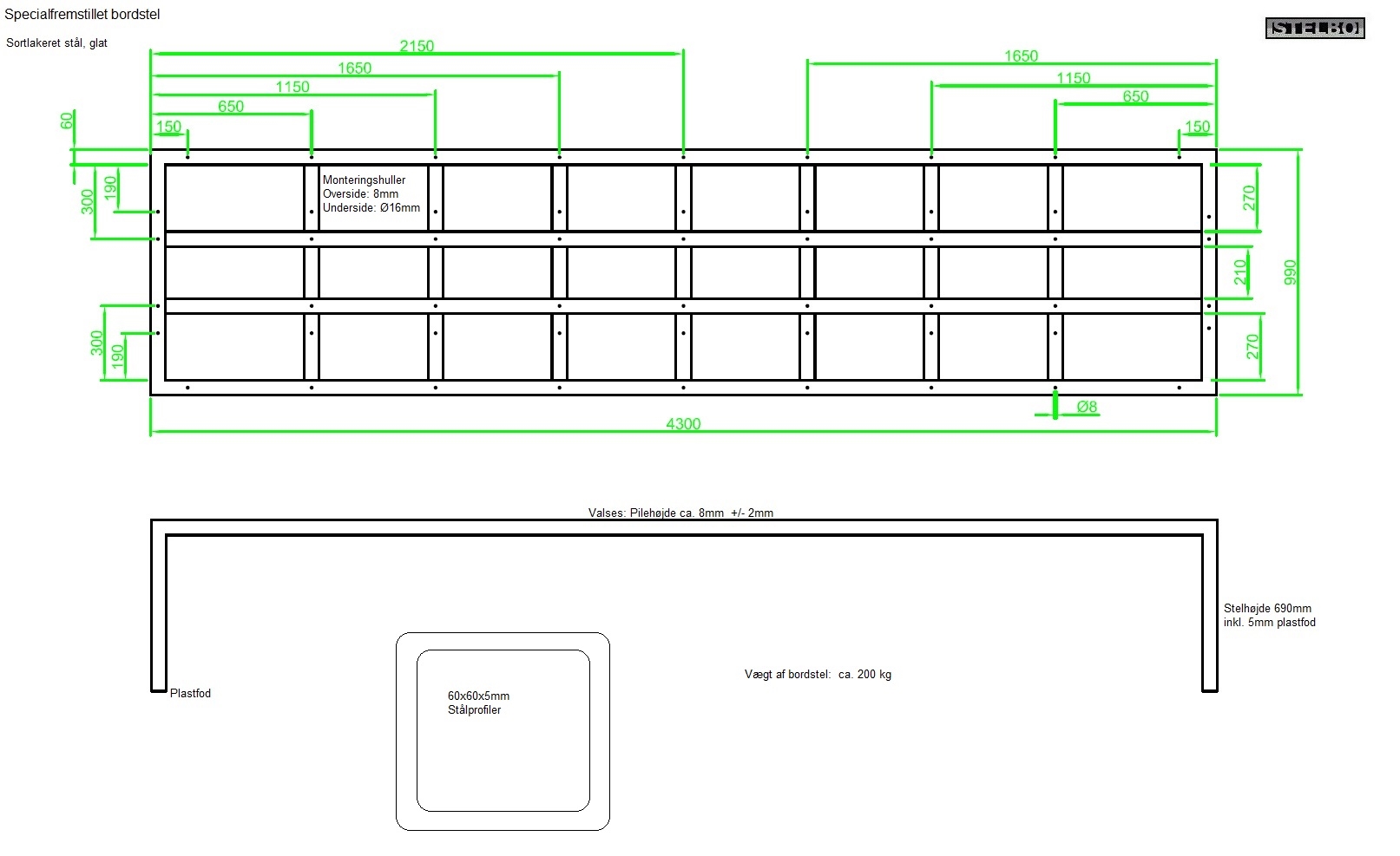 20181115 Specialfremstillet bordstel 430 x 99cm, 60x60mm Sortlakeret stål