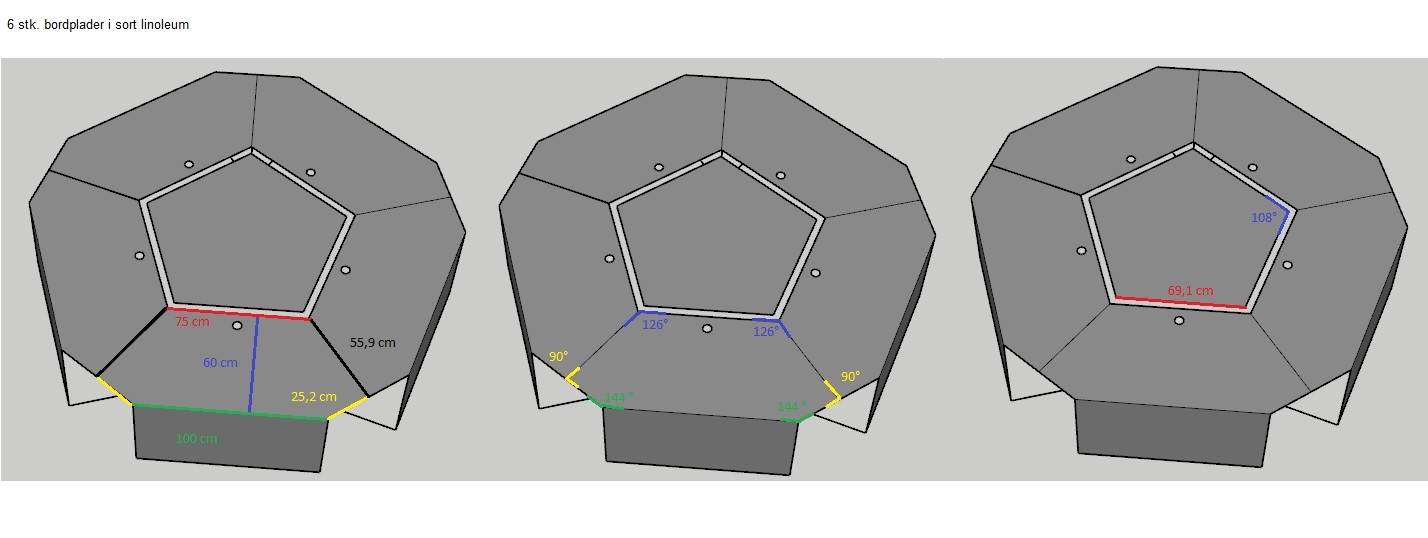+ 1 stk., center bordplade, 5-kantet, sortlakerede kanter – Pris kr. 1250,-