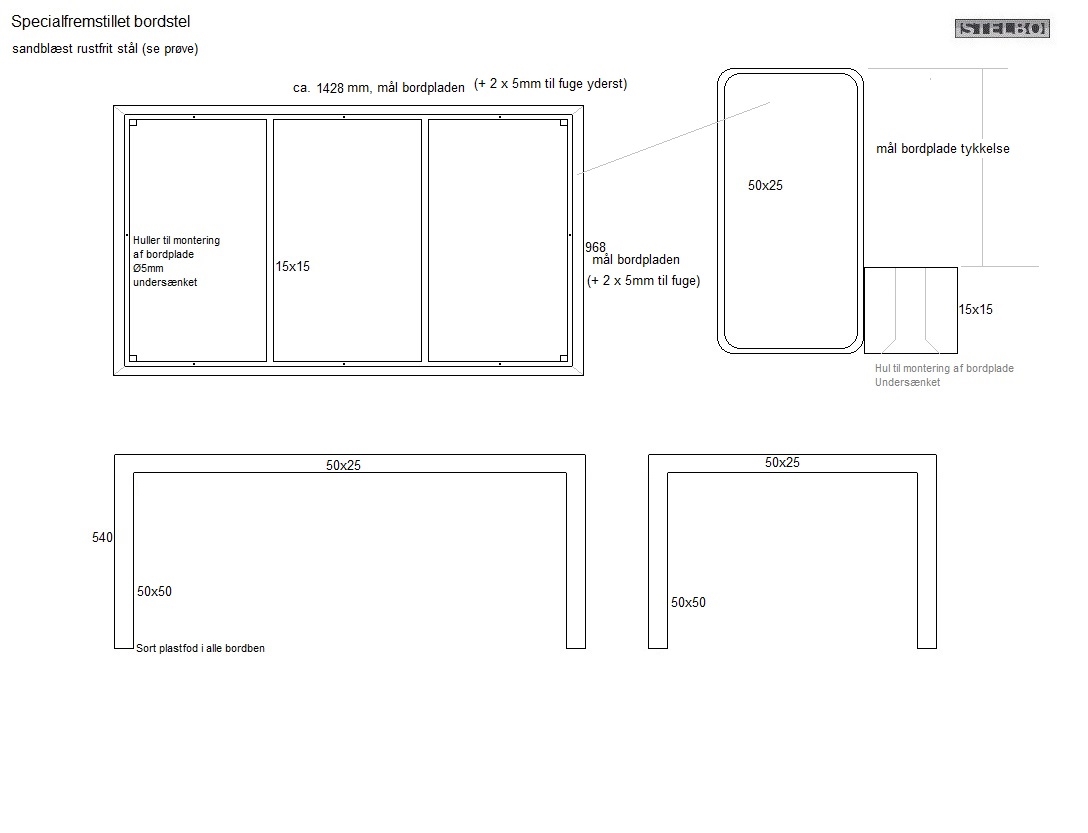 Fugning imellem bordplade og stålstel med silikone(farve?): 1000,-