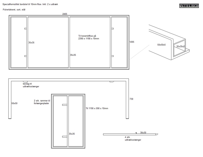 20190911 Specialfremstillet Bordstel med 2 x udtræk. Til 10mm flise