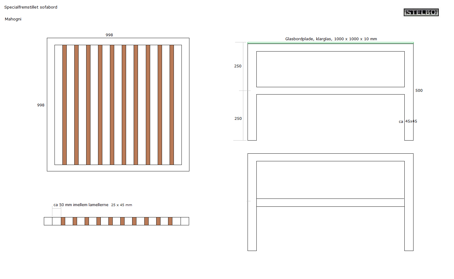 Klar glasplade 850x850x10mm, hærdet: 1120,- Oven på stellet