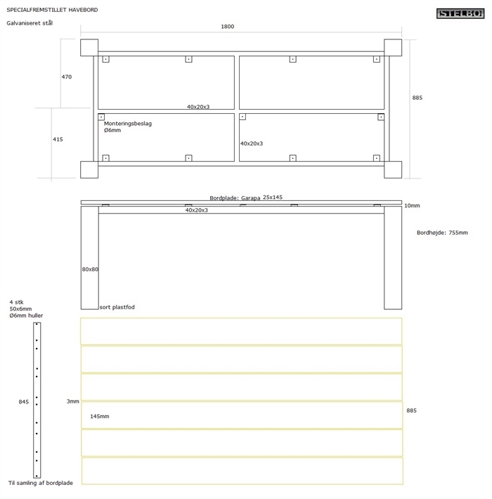4 lister i galvaniseret stål til samling af bordplade: 400,-