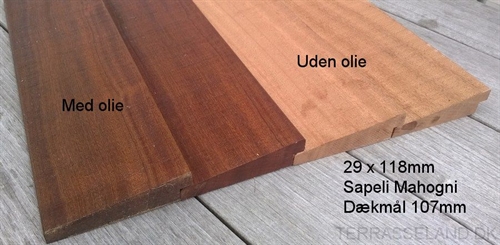 20171101 Klinkbeklædning, Sapele mahogni, 29x118mm, 4x305, 19x325, 2x365cm, 10L Damson olie, fragtSPECIALTILBUD7.000,00 DKK