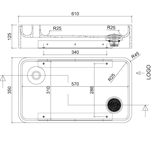 Corian vask inkl. bl. batteri. 610 x 350 x 125mm. Bordmodel