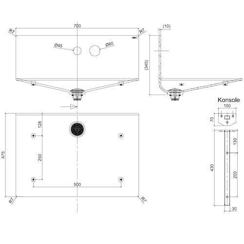 Corian vask inkl. bl. batteri og ophæng. 700 x 475 x 340mm. Vægmodel